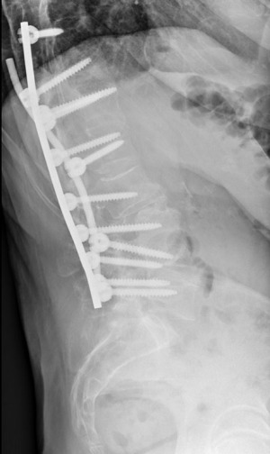 At follow-up a month after the revision surgery, radiographs showed spinal instrumentation intact. The patient reported that the pain subsided and she no longer had radiating pain to the leg. Her mobility and gait have improved greatly, and she was able to return to work.