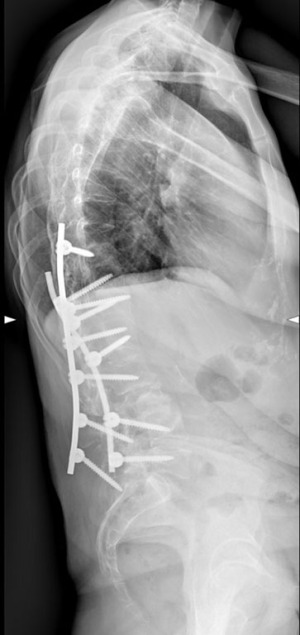 At a follow-up nine months post-revision surgery, the patient’s symptoms were stable with no pain at rest and a 2/10 VAS while walking without radiating pain. X-rays revealed the spinal instrumentation to be intact. We’re planning to follow-up with the patient in 6–8 months to monitor her condition.