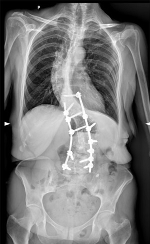 At the age of 16 [1983], she presented with a right-sided thoracic curve at 71° Cobb angle and a left-sided thoraco-lumbar curve at 81° and was treated with a distraction Harrington rod from Th4 to L3 and a plaster cast. After five years, there was a significant correction with a Th6-Th11 curve of 49° and a Th12-L3 curve of 46°. The Harrington rod was removed due to a high risk of rod breakage during childbirth.