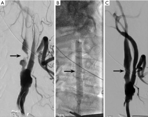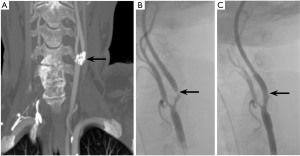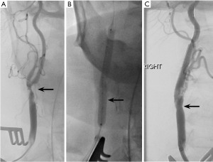 A 73-year-old female with asymptomatic, severe left internal carotid artery (ICA) stenosis diagnosed based on carotid duplex ultrasound (DUS) [ICA peak systolic velocity (PSV) 419 cm/sec, ICA/common carotid artery (CCA) ratio of 7.2] and confirmed on computed tomography angiography (CTA) (Figure 1A). The lesion was 21 mm long, and a circumferential calcification thickness of 4 mm was evaluated for possible intervention. The CCA was free from atherosclerotic disease. She also had asymptomatic, moderate right ICA stenosis. Cardiovascular risk factors included smoking (former), obesity [body mass index (BMI) =37 kg/m2], history of myocardial infarction, congestive heart failure (CHF) [ejection fraction (EF) 30%], chronic obstructive pulmonary disease (COPD) and chronic kidney disease stage (CKD 3a). Due to extensive comorbidities, the decision was made to treat her with minimally invasive left trans-carotid ICA IVL, followed by stenting. The procedure was conducted through a 3 cm left supraclavicular incision. Through the 8 Fr ENROUTE sheath (Silk Road Medical Inc., California), an intraoperative angiogram was obtained, demonstrating 85% stenosis of the ICA (Figure 1B). After the CCA was clamped, under roadmap assistance, a 0.014 wire was advanced beyond the lesion. The lesion was pre-dilated with a 5 mm shockwave balloon with good luminal gain (4 cycles, 30 seconds each), followed by the deployment of an 8 mm × 40 mm PRECISE stent (Cordis, Miami Lakes, Florida). Flow reversal was then allowed for 2 min. Completion angiography was performed after the removal of the proximal clamp, which revealed no dissection, contrast extravasation, or residual stenosis (Figure 1C). Total flow reversal time was 12 minutes. At six-month follow-up, the patient remained neurologically intact, and the carotid DUS showed widely patent stent (ICA PSV 127 cm/sec, ICA/CCA ratio of 2.3).