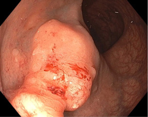 EGD and colonoscopy were performed to evaluate for a GI primary. EGD revealed no abnormalities in the esophagus, stomach, or duodenum. Colonoscopy identified a large rectal lesion resembling a submucosal tumor with a friable surface (Figure 5).