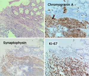 Histopathological confirmation is essential to avoid misclassification. GI-NECs are characterized by positive immunohistochemical staining for neuroendocrine markers such as synaptophysin and chromogranin A. They are also defined by a high proliferation rate, with a Ki-67 index greater than 20%, which correlates with the poor oncologic prognosis associated with these malignancies (11,13).