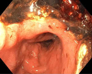 The patient continued to experience dysphagia despite esophageal stent insertion. His case was reviewed by the oncology service; however, he was deemed unsuitable for palliative chemotherapy due to increasing frailty, likely secondary to rapidly progressive disease, reduced oral intake, and significant weight loss. He subsequently underwent a course of palliative radiotherapy targeted to the esophagus and stomach with the aim of relieving obstruction. Unfortunately, clinical benefit was minimal, and the patient’s condition deteriorated rapidly, with persistent dysphagia and respiratory failure secondary to malignant pleural effusions. Given his poor prognosis and ongoing clinical decline, he was transferred to hospice care and died approximately one month after his initial presentation.