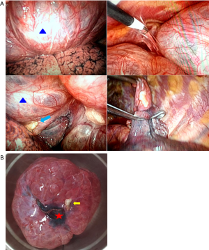 Through the video-assisted thoracic surgery (VATS) with left-sided, two-port technique was used to gain to the thoracic cavity. The giant bulla was located at the dorsal segment of lower lobe presents as a about 16-cm-sized single giant emphysematous bulla, majority compression of the left upper lobe, the multiple pleural adhesions and a nodule was a base of 1.5 cm arose from the giant bulla wall showing grayish-white, protruding, rigid and clear boundary were identified (Figure 2A).