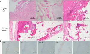 Microscopical examination of the giant bulla showed the bulla wall is fibrous connective tissue, coating layer of flat cells, accompanied by a small amount of inflammatory cell infiltration (Figure 3A) (hematoxylin and eosin, original magnification ×4). The epithelial lining of bulla wall was positive for thyroid transcription factor 1 (TTF-1) and negative for CD1a, human melanoma black-45 (HMB-45), CD-10 or Ki-67 (Figure 3B). In addition, trabecular bone, cartilage, adipose tissue and irregular glandular cavity like structure were found in the nodular lesion, and the cell atypia was not obvious (Figure 3A). In accordance with the above findings, the final diagnosis was consistent with concomitant GBE and a pulmonary hamartoma arose from the bulla wall. After surgical resection via VATS, the lung was re-expanded well and no air leak was noted (Figure 1A), chest tube was removed on second postoperative day. The patient was completely recovered without any event and was discharged. She is currently asymptomatic and doing well after 9 months of follow-up.