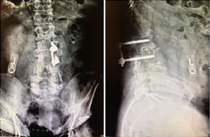 The patient is a 72-year-old male with a symptomatic history of severe chronic pain in bilateral buttocks and lumbosacral regions as well as a prominent L2 spinous process. His past medical history included hypertension, hyperlipidemia, gastroesophageal reflux disease, nephrolithiasis, deep venous thrombosis, and severe postoperative constipation after prior surgery, which was successfully treated with conservative management. His surgical history included bilateral inguinal hernia repair, removal of nephrolithiasis, and multiple posterior spinal surgeries resulting in fusion from L2-L5. He had continued symptoms of lumbosacral spondylosis with failure of nonoperative management including physical therapy, injections, and pharmaceutical therapy. Radiographic (Figure 1) and MRI findings were consistent with degenerative disc disease of L5-S1 and evidence of successful fusion L2-L5.