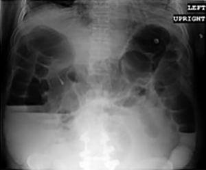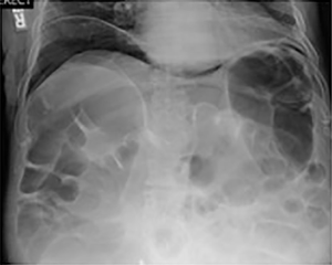 Acute colonic pseudo-obstruction (ACPO) is characterized by acute dilation of the large bowel in the absence of any mechanical obstruction (9). It is also known as acute colonic ileus or Ogilvie’s syndrome. It is associated with many metabolic, surgical, and pharmacologic factors. Diagnosis of ACPO is typically made by clinical presentation of abdominal distension, constipation, nausea, and vomiting. Bowel sounds may or may not be present. The pathogenesis is not completely understood but likely results from autonomic dysregulation of colonic motor function (10). ACPO is typically treated conservatively, which includes treating the underlying disease such as correcting underlying electrolyte abnormalities, discontinuing drugs causing gastric hypomotility, increasing hydration, ambulation, and encourage use of bowel stimulating medications. Administration of neostigmine is considered in severe cases to stimulate bowel function. Neostigmine is an anticholinesterase inhibitor, which allows an increase in acetylcholine availability and parasympathetic activity. This results in increased colonic peristalsis. It should be used cautiously in patients at risk for severe bradycardia (6). When conservative treatment fails, decompression is required via colonoscopy or a transrectal tube. Decompression of the colon is used to decrease the parietal tension, increasing blood flow, and promoting peristalsis to relieve symptoms. In severe cases, an increase in intraluminal pressure can cause bowel necrosis and eventual spontaneous perforation can occur, which has a mortality rate approaching 50% (10).