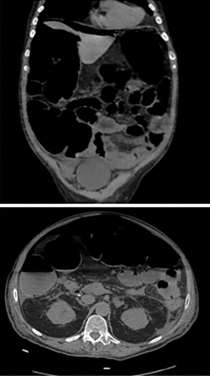 On postoperative day 5, the patient suddenly experienced an acute exacerbation of abdominal pain. An upright abdominal radiograph (Figure 3) demonstrated findings consistent with free air under the diaphragm. A computed tomography scan of the abdomen (Figure 4) demonstrated pneumoperitoneum and dilation of the large and small bowel extending to the splenic flexure. Of note, there was no apparent orthopaedic implant complications or suspicion of mechanical obstruction. He was started on antibiotics and was taken to the operating room by general surgery for an exploratory laparotomy. Intra-operative findings were significant for multiple abdominal adhesions and multiple pinhole sized perforations at the splenic flexure and cecum. Suture repair of all perforations and an adhesiolysis was performed. A nasogastric tube was placed at the end of surgery.