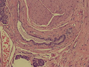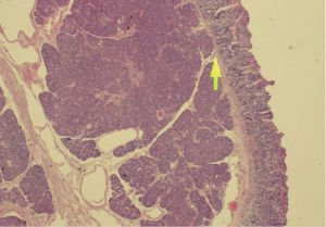Surgical excision is potentially curative for HP, with local excision being preferred over radical surgery (5). Surgical excision will also provide tissue for histological diagnosis and evidence to rule out malignancy (2). Additionally, surgical excision may prevent future complications. General complications of HP are similar to those of the orthotopic pancreas and include pancreatitis, pseudocyst formation, and malignant transformation (1,2). There have been reports of intraductal papillary mucinous neoplasms that have arisen from the malignant transformation of EP tissue (6). Malignant transformation of HP is rare (0.7–1.8% of cases) and is estimated to be similar in frequency as that of the native gland (3,16).