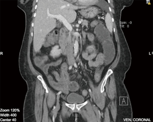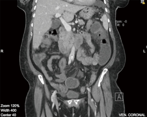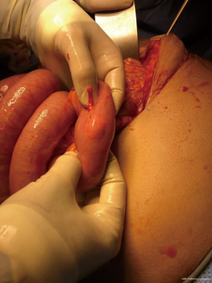The patient was scheduled for an urgent diagnostic laparoscopy bowel exploration as indicated by the CT findings of free air under the diaphragm and suspicion of intussusception in an immunocompromised patient. An alternative diagnosis considered was that of neutropenic typhlitis, which has similar symptoms, CT findings and presents in severely immunocompromised and myelosuppressed patients. Preoperatively, the patient was given 2 units of irradiated platelet apheresis, 1 unit of packed red blood cells (PRBC) and received an immediate dose of Neupogen 300 mcg.